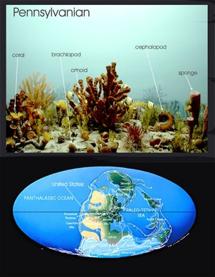 Benedum Hall of Geology includes the type specimen of a Pennsylvanian Age giant eurypterid trackway from Elk County, Pennsylvania, Pennsylvanian Age marine fossils from the regional fossil sites of the Ames Limestone and Brush Creek Limestone, and Mississippian Age brachiopods from Missouri. In the Mesozoic Age Dinosaurs in Their Time, invertebrate fossils are represented in the Triassic diorama from Germany, the Jurassic of Lyme Regis, England, Holzmaden and Solnhofen of southern Germany, and Late Cretaceous of Montana and South Dakota.