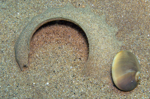 These unique boreholes allow scientists to track the evolution of moon snails from the Miocene to recent times. One group of researchers found that moon snail cannibalism might have driven a kind of coevolution between and among moon snail species. Because one moon snail can make dangerous prey for a fellow moon snail predator, over time moon snails seem to have learned to drill other moon snails at a spot on their shells that allowed the predator to cover the prey’s entire aperture, preventing the strong foot of their prey from fighting back. This means boring through a thicker part of the shell, however, so it takes longer to hold down and bore through the prey snail’s shell. But the record of natural selection in fossils throughout time suggests the added cost must be worth the benefit of moving target drilling zones. Meanwhile, small moon snails almost always lose out to larger ones when attacked, so both N. duplicata and E. heros have evolved to get bigger and bigger over time – although a bigger snail is also a more enticing snack target. Same-sized moon snails don’t even bother to attack one another, suggesting that a fellow moon snail is just too dangerous a prey when the winner of the battle between snails is a toss-up. As evidence that these are often battles between predator and prey snails, there are many incomplete boreholes found – a moon snail started attacking another moon snail, but only managed to get the job halfway done before the prey moon snail escaped. [1]