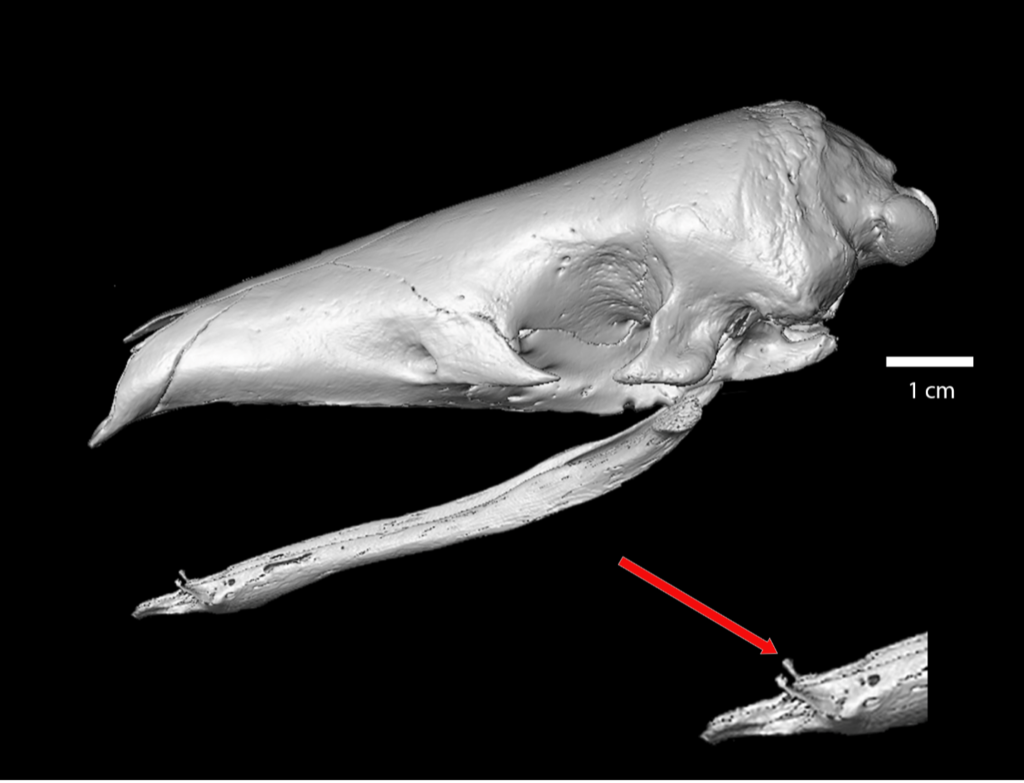 The other very odd thing about the pangolin mandible is that it has a pair of bony prongs at the front that look somewhat like teeth (red arrow). Doran and Allbrook (1973: Journal of Mammalogy) dissected the pangolin tongue and reported that the lower lip was attached to these prongs, but they did not illustrate this or explain it further. Pangolins are clearly doing something different with their mandible than the tamanduas and echindas are, but what, I don’t know. Whatever it is, it has been around in pangolins for at least 35 million years! There was a pangolin that lived in the American West during the late Eocene named Patriomanis americana and it has a set of mandibular prongs just like those in the Sunda pangolin shown here. The other difference with the pangolin mandible is that when subjected to a wishbone pull, it might not break down the middle and be more like a furcula.