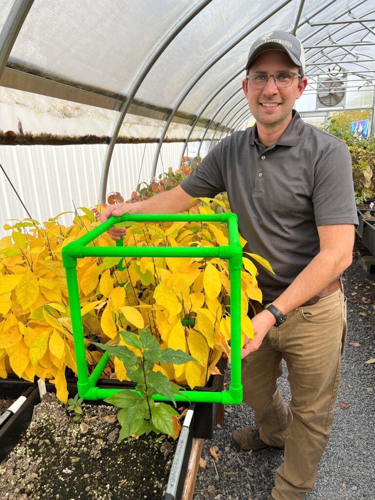 On a late October afternoon, Joe Stavish, Director of Education for Tree Pittsburgh, uses a biocube in one of the organization’s greenhouses to show off the golden fall foliage of northern spicebush saplings. If the cube could accompany one of these native shrubs when it’s planted in a local park as part of forest understory restoration, the open-sided green frame might document a surprising variety of wildlife.