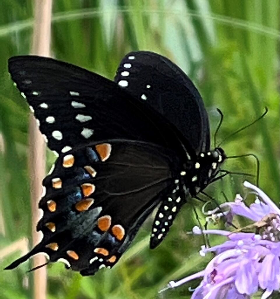 Early spring observations might also detect what appears to be a narrow, two-inch-long dead leaf attached to one of the shrub’s twigs. This is the over-wintering chrysalis of the spicebush swallowtail, a butterfly whose caterpillars are known to favor the spicebush leaves as a food source. After the plant is fully leafed, observation of spicebush foliage within the biocube might produce a sighting of the caterpillar’s distinctive fifth instar or larval stage.