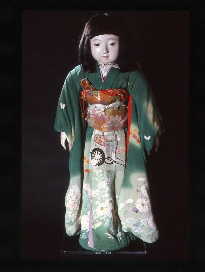 Created as part of a doll exchange program between the children of Japan and the U.S., Miss Kochi and her sister dolls were lovingly made with the hope of promoting peace between the two countries in the years leading up to World War II. Crafted by some of the most respected doll makers in Japan, the ambassador dolls, as they were also known, are all 85cm high. They have moveable arms and legs and real human hair. Each is dressed in a colorful kimono made of pure silk and accompanied by lacquered tea sets, furniture, and other accessories used in the celebration of Hinamatsuri, or Doll’s Day. Miss Kochi is dressed in a beautiful, embroidered, emerald green kimono with a red sash.