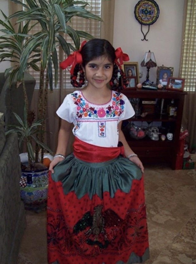 This doll is a folklórico dancer! Made in Cuernavaca, Morelos, México, this doll joined the museum’s collection as a donation in March of 1950. She is made of wool and cotton and has black braids (trenzas folklóricas), a white embroidered blouse (blusa bordada), and a sequined red and green skirt (china poblana). All these components make her instantly recognizable as a ballet folklórico dancer (folk dancer). Her skirt is designed after one of the most recognizable traditional styles of dress in Mexico, la china poblana. China poblana skirts tend to be heavy as they are made with layers of embroidery using sequins and beads to depict the Mexican coat of arms of the eagle perched on a cactus with a snake in its mouth. Historically, this style of dress was popular in the state of Puebla, but nowadays it is typically worn by dancers when performing El Jarabe Tapatío, which is a dance from the state of Jalisco and México’s national dance.