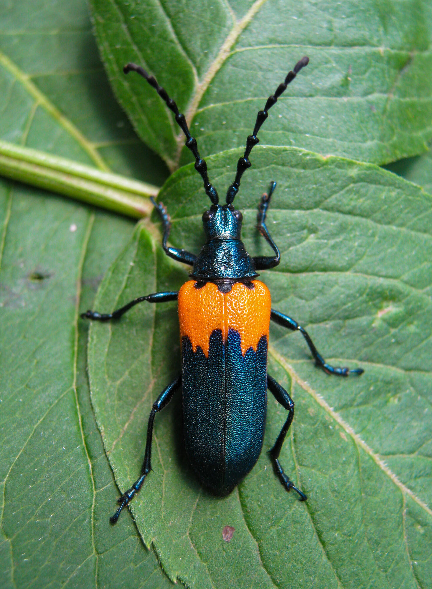 As I was examining the elderberry plants, visions of one of the eastern United States’ more aesthetic species of Cerambycidae flashed into my head – that of Desmocerus palliatus (Forster), or as it’s known by its common name, the elderberry borer. The larvae of the beetle bore in the living pith at the base of the stems. The adults are a beautiful metallic blue with the basal half of their elytra vivid orange. The beetle can be found on elderberry plants, either walking on the stems or clinging to the underside of the leaves. On hot days from May to early July, they can sometimes be found flying around the plants in search of mates.
