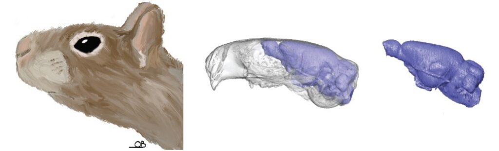 Recently, one of my colleagues, Ornella Bertrand from the Universitat Autònoma de Barcelona, Spain, and coauthors have studied the evolution of the brain in squirrels. From CT scans of fossil skulls (see images below), they were able to recreate various parameters of the brain, including the relationship between brain size and body size. They found that squirrels living in trees had larger brains to their body size than other squirrels, that life in the complex arboreal environment was a driver of brain evolution in squirrels. The result of this evolutionary story for us may be that we will always be hard pressed to build a bird feeder that those big-brained tree squirrels can’t get into!