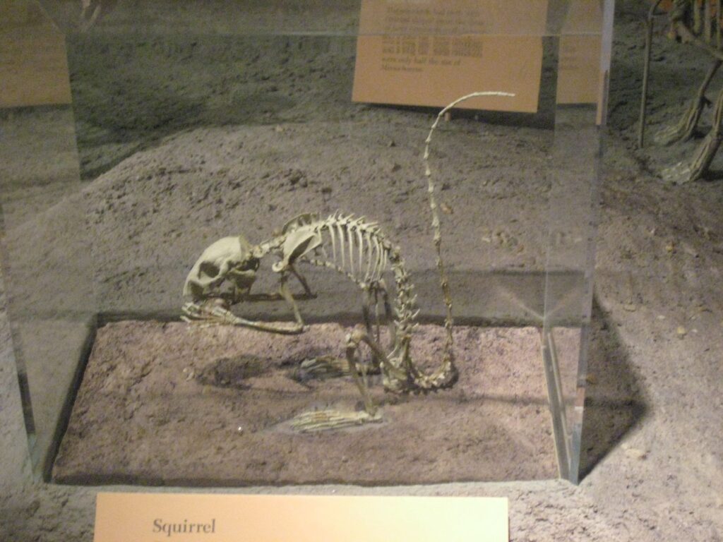 Squirrels have a long evolutionary history. The oldest fossils identifiable as squirrels first appeared around 34 million years ago in western North America, all showing adaptations to tree life. One of these, Protosciurus, is on display at the Smithsonian in Washington, D.C. (see below). Its skeleton is remarkably like those of living gray squirrels, both in size and morphology. Given that this remarkable similarity occurred over 30 million years of geological time, scientists consider our gray squirrel and tree-adapted relatives to be living fossils, that is, not dramatically changed compared to their very ancient relatives.