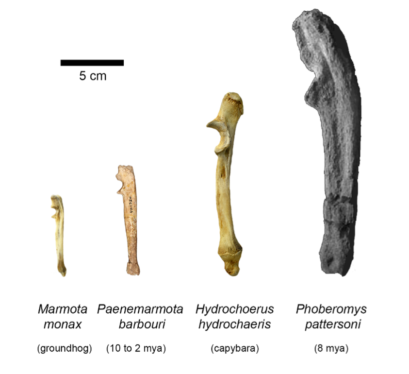 Most rodents are small mammals; think mice and their relatives. Punxsutawney Phil is the second largest living squirrel; his cousin, the hoary marmot, Marmota caligata, from the Pacific Northwest is slightly larger, with adult males typically over 20 pounds. There was a larger ground squirrel that lived in western North America between 10 and two million years ago, Paenemarmota, a Latin name that translates to “almost a marmot.” Some of my colleagues have called it the “giant marmot,” which should be taken with a gigantic grain of salt! Below is an image of four ulnae, one of the two bones in the forearm. On the left is the living groundhog and next to it is the “giant marmot.” Anatomically, the bones are nearly identical, with one a little larger than the other. Weight estimates for the “giant marmot” are around 35 pounds. Yes, that is big for a squirrel, but not compared to some truly giant rodents. Next to the “giant marmot” is the ulna of the largest living rodent, the semiaquatic Central and South American capybara, Hydrochoerus, which translates to “water pig.” Capybaras, which can grow to nearly 150 pounds, are related to guinea pigs! But wait, there is more. Capybaras pale in comparison to the largest rodent that ever lived. The 8-million-year-old Proberomys from Venezuela was estimated to be the size of a large African antelope at 300 to 550 pounds. Yikes, now that is a giant guinea pig.