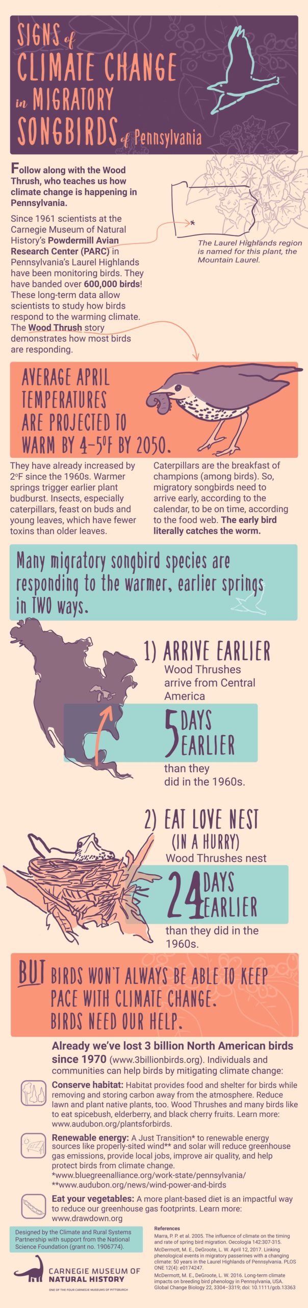 This infographic looks to migratory songbirds as teachers, showing us how climate change is here and now rather than somewhere else in the future. These birds, and the Powdermill Avian Research Center scientists who study them, show us how climate change is speeding up their arrival from the south and the timing of their nesting dates – a pace they might not be able to keep up with. You can use this infographic to share the story of migratory songbirds, something everyone in Western Pennsylvania can notice and care about, and start a conversation about what we can do to help them in the face of a changing climate.