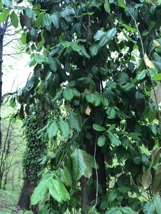 Ok, now back to the plant! Winter creeper (Euonymus fortunei), native to Asia, is commonly planted in Pennsylvania and many other places, and unfortunately has also spread to become invasive. It is still commonly planted. It is a woody vine that climbs trees, but also is a thick ground cover. It has leaves that persist through the winter, with attractive fruits. Despite those advantages, it can impact native species and habitats as an invasive species, and therefore, should not be planted.