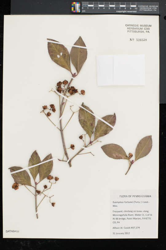 This specimen of wintercreeper (Euonymus fortunei) was collected on January 31, 2012 along the Monongahela River in Fayette County, PA by Alison Cusick. Alison Cusick is a current Research Associate in the Section of Botany at the museum. He can be frequently found in the Carnegie Museum herbarium. He has a unique wealth of knowledge on plants, herbaria, botanical history, and more. He authored three books and more than 50 scientific papers on the flora of eastern North America. Before retiring, he was the Chief Botanist for the Ohio Department of Natural Resources. He continues to collect today, and many thousands of his specimens can found at herbaria across the country.