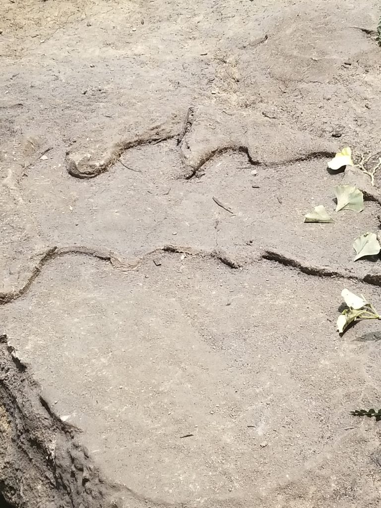 Moving into the Jurassic portion of the exhibition, we stepped back in time, figuratively speaking, by more than 80 million years, and were dwarfed by huge, long-necked, plant-eating dinosaurs (sauropods). We also found very different-looking tracks, some of which were overlapping. Our questions multiplied: could tracks like this indicate that these enormous beasts walked in herds? Is it possible to match up the toes of the foot with the footprint? Was the wide, flat heel of sauropods important for weight distribution?