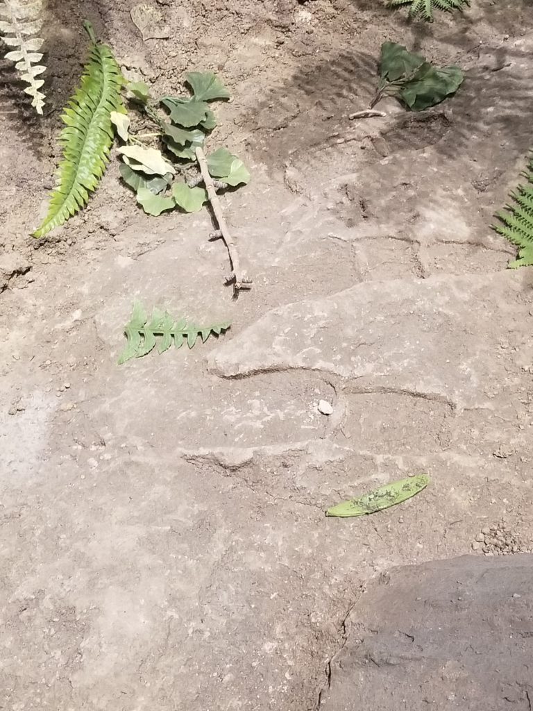 At this point, Dr. Matt Lamanna, the person most responsible for the scientific content of the now-15-year-old hall, walked by. Gurgling with excitement, we showed him the footprints. He was delighted by our find. “Yes. Two ‘Easter Eggs.’ When Dinosaurs in Their Time was built, we included many simulated footprints, sculpted on the basis of actual fossilized dinosaur tracks. I only wish I’d been able to add a few fake coprolites (fossil poop) too.”