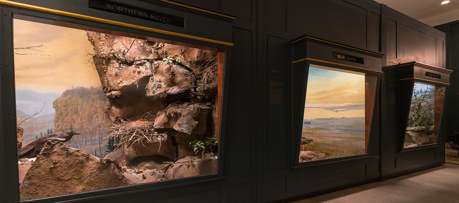 The dioramas feature wildlife like blue geese and aurora trout in stunning replications of scenes from nature. The dioramas were created at the height of the craft and feature detailed, hand-painted backgrounds, expert taxidermy, and scientifically accurate flora and fauna. The exhibition also features two antique “bubble-glass” commercial taxidermy pieces that were once popular in homes and parlors.