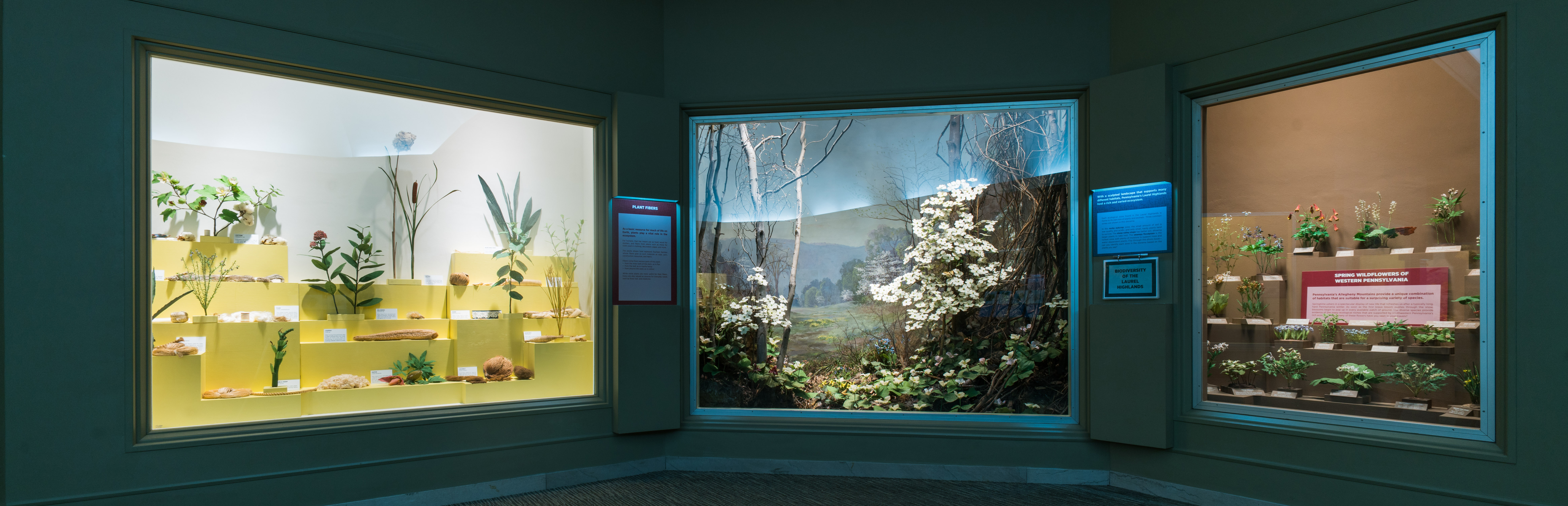 The hall also has several dioramas to show the plants and diverse habitats present in Western Pennsylvania. Local habitats like Lake Erie’s Presque Isle during the summer, a Warren County bog in the fall, and the Allegheny National Forest in the spring are all represented in Hall of Botany.