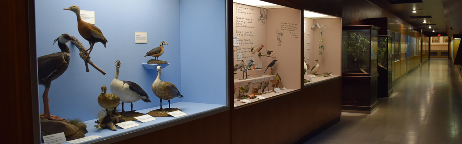 Bird Hall has an array of birds collected over two centuries that illustrate many topics: Endangered and Extinct Species, Flightless, Tropical Rainforests, Birds of Paradise, Sexual Dimorphism, Avian Reproduction, Aquatic Birds, Adaptations for Feeding, and Defining Species. The lower hallway mostly displays non-passerines (non-perching birds) found in Pennsylvania: ducks, raptors, herons, doves, shorebirds, gallinaceous birds (ground-feeding game birds), and more.